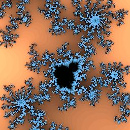 | | Diese Bilderfolge veranschaulicht die Selbstähnlichkeit von Fraktalen am Beispiel des Apfelmännchens, das hier in einer Diashow von Ausschnitten mit zunehmender Vergrößerung gezeigt wird. Die Vergrößerung des letzten Bildes gegenüber dem ersten ist ca. 260000fach, die erforderliche Rechenzeit ist 64 mal länger. Sie starten die Diashow durch einen Klick auf das Bild. Alle weiteren Bilder erscheinen dann in einem Abstand von 5 Sekunden (je nach Übertragungsgeschwindigkeit kann es auch länger dauern). Bitte achten Sie jeweils auf die Bildmitte! |